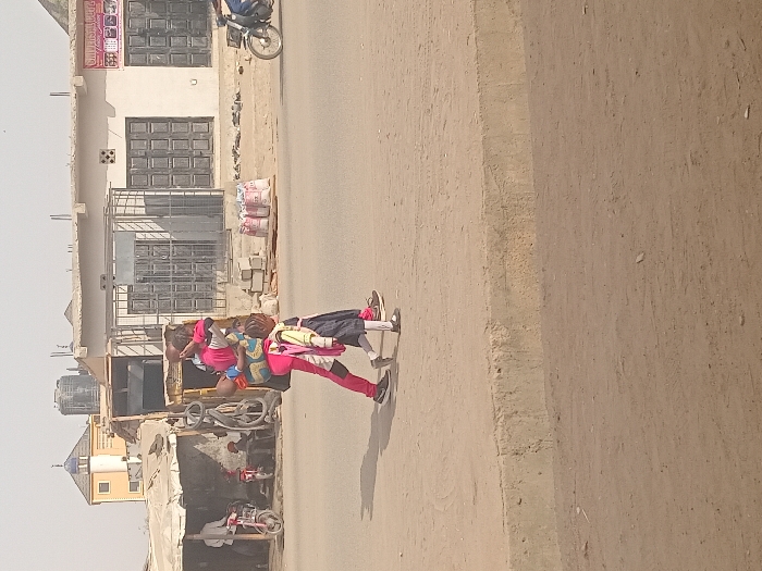 Three children walk along a roadside sidewalk. They wear colorful clothing and carry backpacks. Buildings and commercial properties flank the street, and a parked motorcycle stands nearby. The area appears to be a busy, possibly urban environment, under a bright, sunny sky. A significant portion of the image is of the dirt sidewalk.