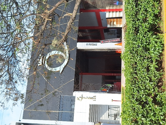 front of a building with a large "Q" with a crown above it. The building is a dark gray color with a white trim and a large metal door in the center. The building has a sign that says "Q" in large letters. The building is located in the city of Jose Luis Bustamante, Peru, at the coordinates -16.419, -71.526. There are trees in the background, and a small, green bush in front of the building. There is a metal spiral staircase to the left of the building. The door to the building is open and there are orange traffic cones in front of the door. There is a sign on a metal stand in front of the building that says "Taxi" in red letters. There is also a white shelf unit with various items on it to the right of the building. The building is likely a business.