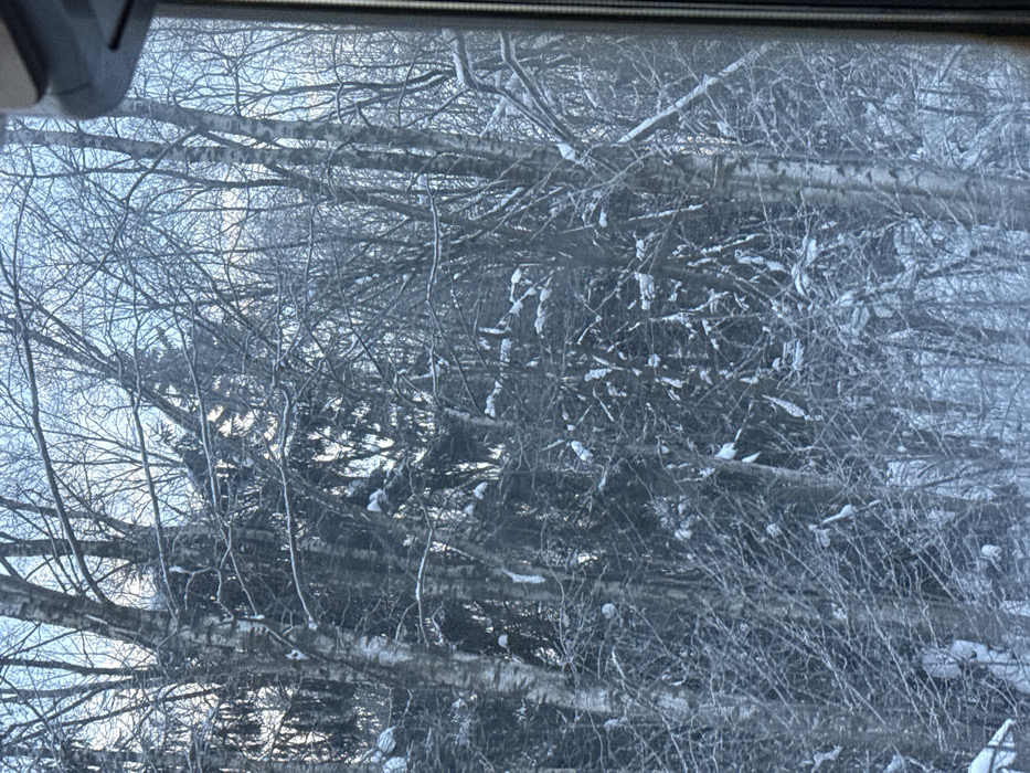 This image depicts a snow-covered forest scene in Zanevka, Russia, viewed through a window, indicated by the dark vertical frame on the right. The environment is dominated by numerous trees, primarily bare deciduous trees with light-colored bark (consistent with birch), and darker evergreen coniferous trees. Snow heavily coats the branches and fine twigs of all visible trees, accumulating in clumps on upper surfaces. The forest floor is also covered in snow. The sky appears light and diffuse, suggesting an overcast winter day or early morning/late afternoon light. No people, animals, actions, or specific man-made objects other than the window frame are visible within the forest scene itself.