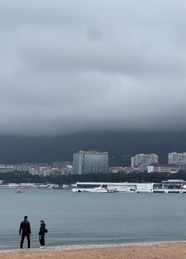 A vertical shot shows a man and a woman standing on a sandy beach, with a city skyline across a body of water in the background. The weather is overcast, with dark clouds obscuring the tops of mountains behind the city. The city buildings appear to be mostly residential, but a single tall, modern building stands out. Several boats are docked in the harbor. The man, dressed in dark clothes, stands to the left of the woman, who is also wearing dark clothes. They appear to be looking out at the water or the city. The beach is made of light-colored sand.