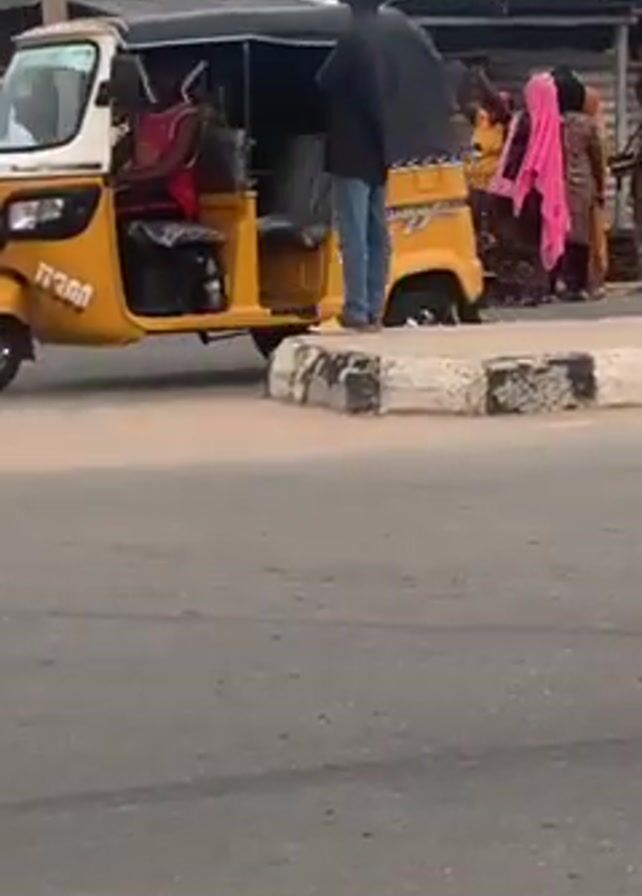 man standing on a street corner holding a sign with a picture of a woman on it. Behind him, a group of women are standing on the sidewalk, talking and looking in different directions. A yellow and black tricycle-type vehicle drives past the man. The setting appears to be a street corner in a populated area, with buildings visible in the background. The light is bright, suggesting a sunny day.