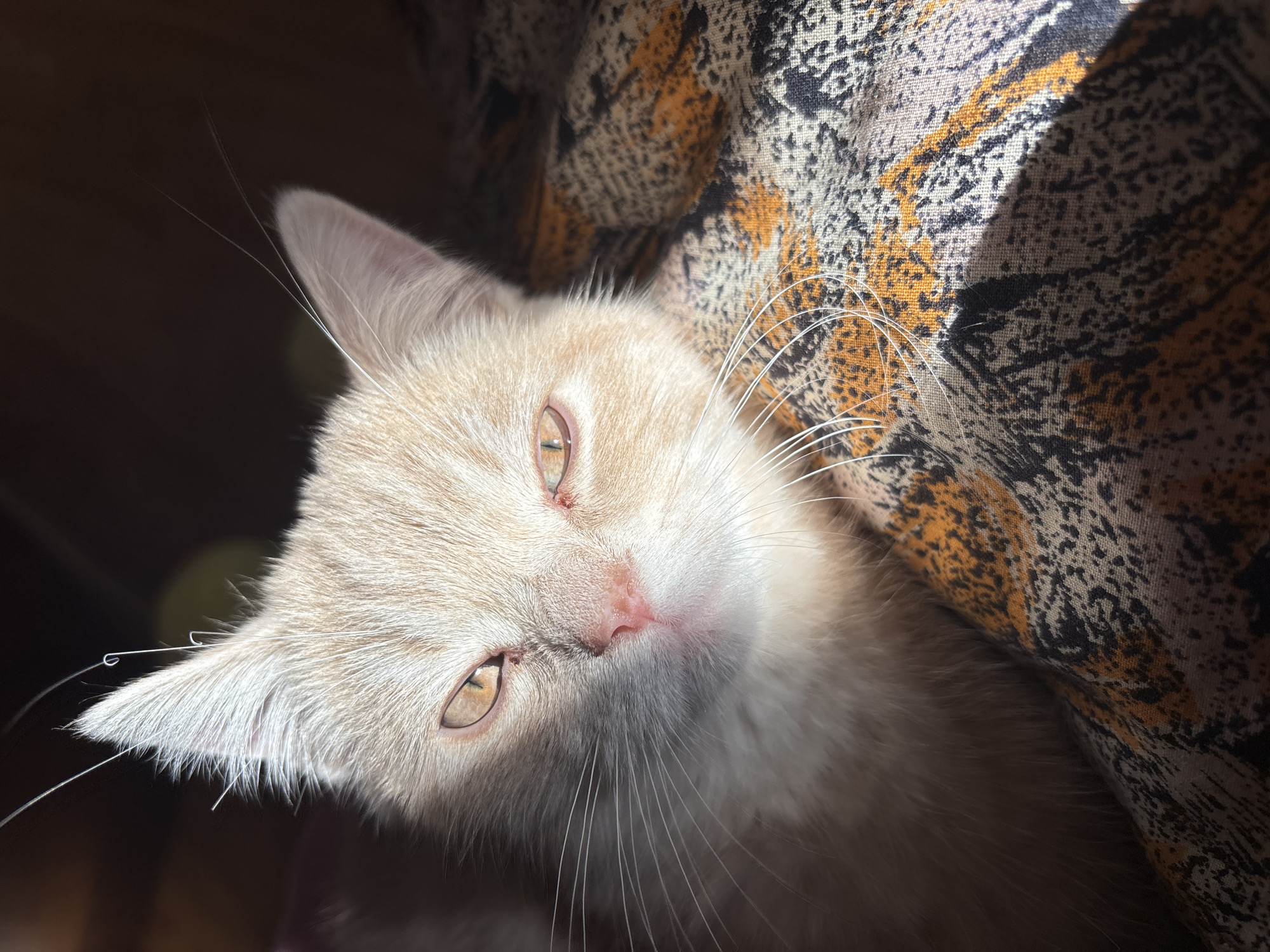 A cream-colored domestic cat is depicted in a close-up, head-shot composition. Its fur is light beige to cream, with amber-colored eyes partially squinted, revealing vertical pupils, consistent with direct light exposure. The cat possesses a pink nose and prominent white whiskers extending laterally. Its pointed ears are visible, with several fine, long, white hairs extending from their upper edges; some are straight, others exhibit a slight curl. A strong, directional light source from the left illuminates the left side of the cat's face, creating distinct highlights and casting shadows on the right side of its face and the immediate background. The cat rests on a patterned textile surface, featuring an abstract design in shades of orange, black, and beige. The background is dark and out of focus. The image provides no discernable information to identify the location as Mizia, Bulgaria.