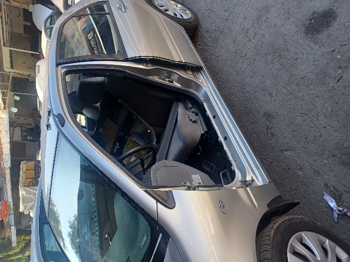 The image depicts a light champagne-colored Mitsubishi Lancer sedan, possibly an early 2000s model, parked outdoors on an uneven dark asphalt surface in what is described as As-Sabina, Syria. The front passenger-side door is fully open, revealing the dark gray interior. The inner door panel on the passenger side is missing, exposing the metallic frame and internal components. The front passenger seat, dashboard, and steering wheel are visible. A multi-spoke silver wheel cover is present on the front passenger tire. On the asphalt foreground, a small crumpled white fabric item with a dark stain and a separate dark liquid stain are present. The background consists of a row of single-story commercial structures or workshops, characterized by exposed concrete and open bays. One bay contains a white vehicle with its hood raised. A partially obscured blue sign with white Arabic script is visible on one building. Overhead, a clear sky and distant tree foliage are discernible. No individuals are present in the frame.