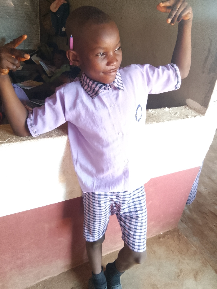 In Ukwu-Abwa, Nigeria, a young, dark-skinned male child with a shaved head is depicted indoors, standing in front of a low, two-toned masonry wall. He wears a light purple short-sleeved uniform shirt with a plaid collar of dark blue and white/pink checks, along with matching plaid shorts, dark socks, and dark shoes. A circular emblem is visible on the left chest of his shirt. A pink pen or pencil is tucked behind his right ear. The child looks towards the viewer's left with a slight smile. His left forearm rests on the wall, with his hand raised and two fingers extended in a "V" gesture. His right forearm also rests on the wall, with his hand raised and fingers slightly curled. The wall features an upper section painted off-white and a lower section painted reddish-brown. The background to the child's left is dark and indistinct, suggesting cluttered shelving or blurred individuals. The background to his right is a plain, darker wall. The floor is an earthy, light brown color.