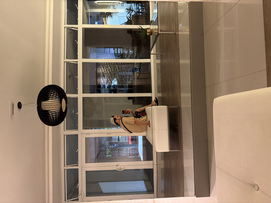 An interior view shows a man seated, casually posed on a white bench, holding a phone