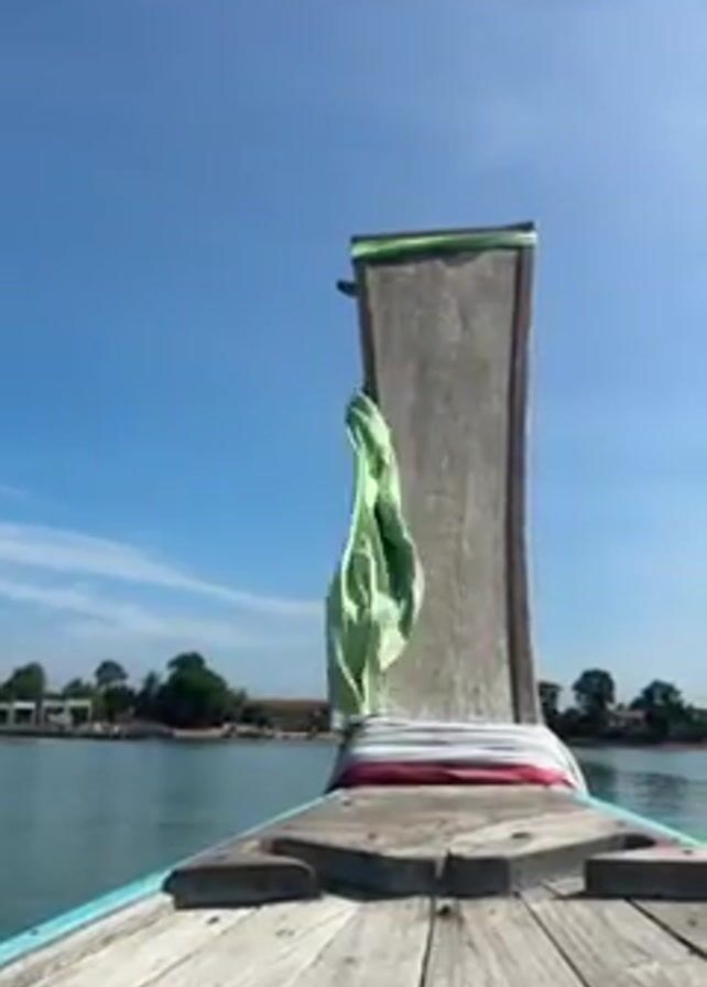 bow of a longtail boat moving on the water. A green cloth is attached to the front of the boat and flutters in the wind. The sky is blue with a few clouds, and land with trees and buildings can be seen in the distance.