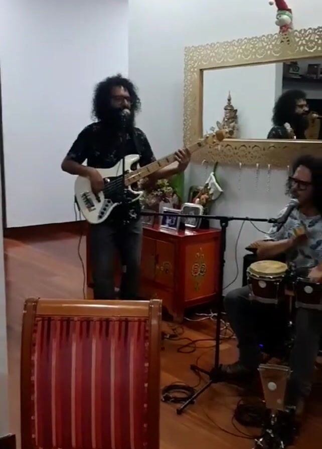 group of three musicians performing indoors. The musician on the left plays a white bass guitar and sings, the one in the middle plays bongos and sings, and the one on the right plays a small guitar and sings. A fourth person, partially visible on the far left, appears to be recording the performance. They are performing in a room with light colored walls and a wooden floor. Behind the musicians are a red chest of drawers, a large decorative mirror, and Christmas decorations. A red and gold chair is partially visible in the foreground.