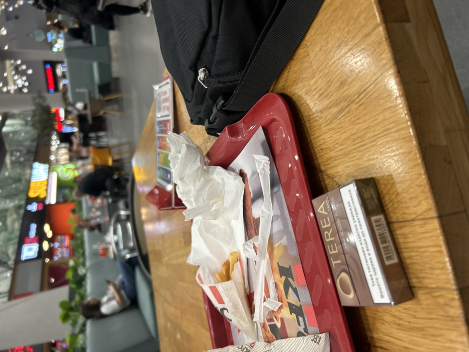 - "The image displays a close-up, eye-level view of a light-colored wooden table in a food court setting, identified as being within a shopping mall in Varna, Bulgaria" by FM-uEVd32, licensed under CC BY 4.0