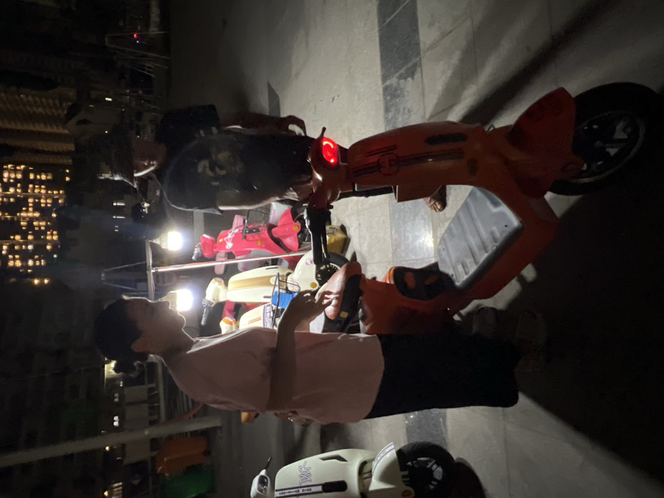 The image depicts an outdoor, nighttime scene in an urban area consistent with Ho Chi Minh City, Vietnam. Two individuals are positioned around multiple electric scooters illuminated by a portable vendor-style lighting setup. On the left, a female wearing a light-colored short-sleeved top and dark pants stands next to an orange scooter, looking down at its handlebars. Her hair is dark and pulled back. On the right, a male, partially obscured, wears a dark graphic t-shirt and a camouflage bucket hat, standing behind the orange scooter. His left foot, wearing a sandal, is visible. The orange scooter in the foreground has a visible illuminated red taillight. To the far left, a white scooter with "DIOR" branding is parked. Further back, under the bright lights, additional scooters in cream/tan and pink colors are visible. The ground is paved. In the distant background, a tall building with numerous illuminated windows is visible, indicating a modern residential or commercial district. The scene suggests a scooter rental or display operation.
