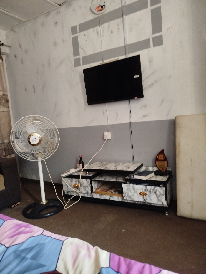 The scene depicts an interior room in Mape, Nigeria, observed from a low angle, possibly from a bed. The foreground is occupied by a bed covered with a multi-colored hexagonal pattern duvet in shades of purple, blue, white, and pink. The floor is brown. The far wall features a two-tone paint scheme: an upper section of light grey with subtle darker mottling or streaks, and a lower section of solid dark grey. A horizontal grey line separates these sections. Geometric rectangular patterns are painted in grey on the upper wall. A small, white circular wall clock with a dark animal silhouette (possibly a horse) is mounted high on the upper wall. A black flat-screen television is mounted on the upper wall, slightly off-center to the right. Wires extend from the television towards a white power outlet positioned on the lower dark grey wall. Below the television is a television stand constructed of dark material with white marble-patterned laminate panels and gold-colored drawer handles. On the left side of the stand, a dark bottle with a red cap is present. On the right side, a dark book is stacked next to a reddish-brown, tear-drop shaped plaque or award with gold accents. An open compartment on the stand reveals items, including what appears to be a tray. To the left of the television stand, a white LG brand pedestal fan with a gold central badge stands on a black base. Its power cord is visible, extending towards the power outlet area. To the far right, a large, off-white, rectangular object resembling a mattress or thick cushion stands upright against the wall, showing some surface discoloration. A dark-colored armrest of a sofa or chair is partially visible on the extreme left. No individuals are present in the scene.