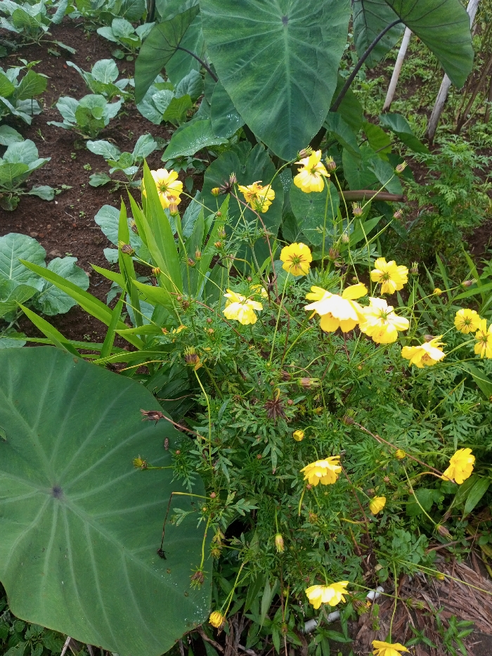 This image depicts a cultivated garden or field in Ingavali, India. The scene is dominated by various plant species under natural light. In the foreground and extending to the right, a dense cluster of yellow Cosmos sulphureus flowers is visible, characterized by numerous vibrant yellow blooms and buds on slender green stems with finely dissected foliage. Several petals show evidence of moisture. To the left, a large, dark green, heart-shaped leaf of a Taro plant (Colocasia esculenta) occupies the lower-left quadrant, displaying prominent veins and water droplets. Further to the left and in the midground, a row of young, light green leafy plants, consistent with cabbage or similar brassicas, grows in dark brown soil. Additional dark green foliage, including more Taro-like leaves, is present in the upper background, along with exposed dark soil. No people or animals are present.