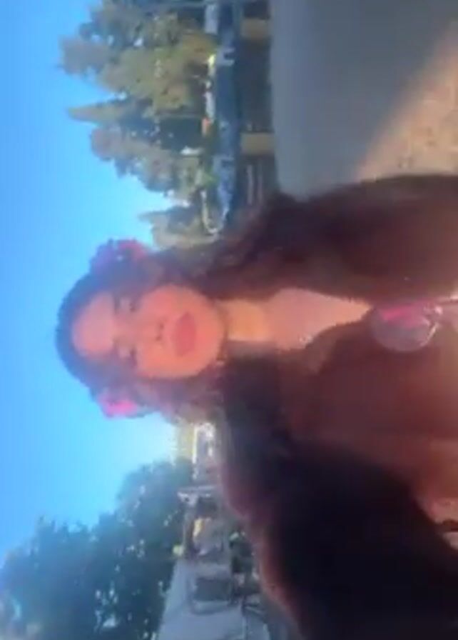 A woman with long, curly brown hair, adorned with two pink flowers, is standing in a sun-drenched outdoor area. She wears a brown fur coat and pink glasses hang from her shirt. The background consists of trees, a fence, and parked cars. The ground appears to be covered in gravel. The sun shines brightly, causing a lens flare in some shots. The camera perspective shifts during the video.