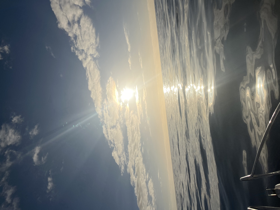 The image displays a sea view. The sun shines brightly through some scattered clouds, creating a glare in the sky and reflections on the rippling water surface. The clear blue sky contrasts with the dark, moving sea. Part of a boat is visible on the lower right side of the photo, and gives some perspective on the location of the viewer.