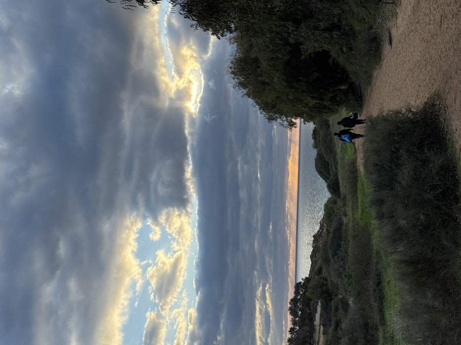 An outdoor scene in Arsuf, Israel, depicts a coastal landscape during late afternoon or sunset. A sandy path runs from the foreground into the midground, sloping gently towards the Mediterranean Sea. Dense green and dark green vegetation, including bushes and trees, flanks the path and lines the coastal cliffs. Two individuals, observed from behind, walk side-by-side down the path. The person on the left carries a blue bag over their left shoulder, while the person on the right carries a dark object in their right hand. Both are dressed in dark attire. The sky is predominantly overcast with dark grey clouds, but sections of bright yellow and orange light from the setting sun penetrate the clouds and illuminate the horizon above the sea. The sea surface is visible in the background under the illuminated sky.