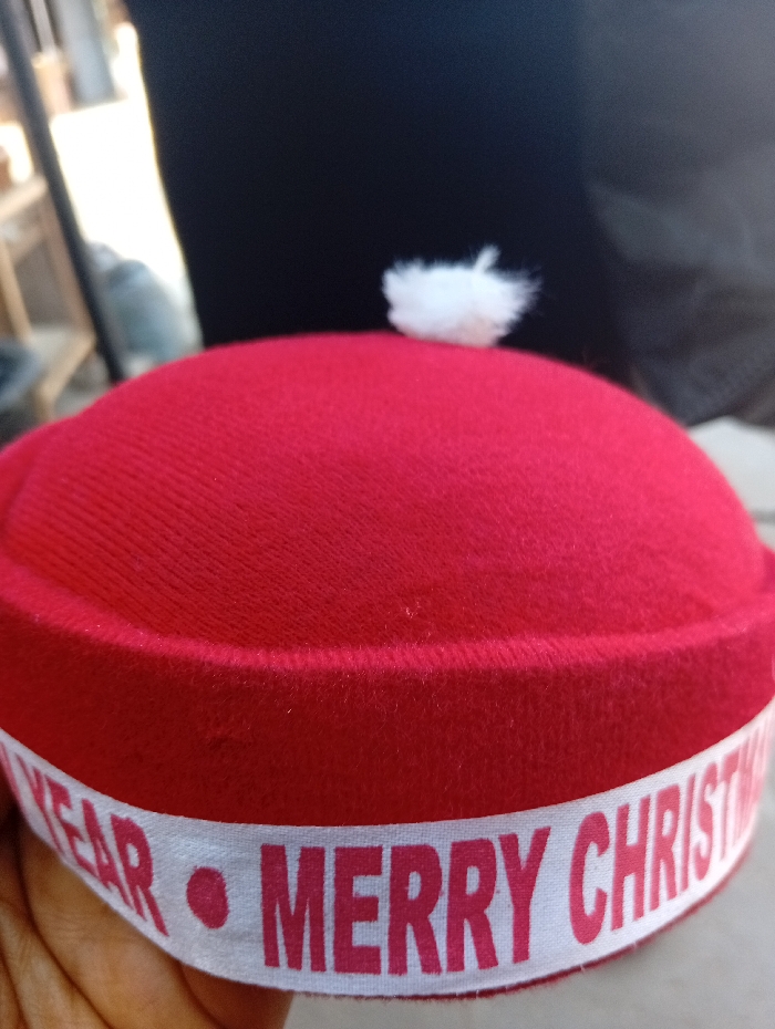 The image displays a red, beanie-style cap or hat featuring a small white fluffy pom-pom positioned towards the top-right from this perspective. A white fabric band with red block lettering is affixed around the lower circumference of the cap; visible text includes "MERRY CHRISTMAS" and the partial word "YEAR," separated by a red dot. The cap is held by human fingers, visible along the bottom-left edge. The background is out of focus, presenting a large, indistinct dark object directly behind the cap, with blurred lighter elements, possibly structural or furniture, to the left. The scene is located in Sabon Tasha, Nigeria.