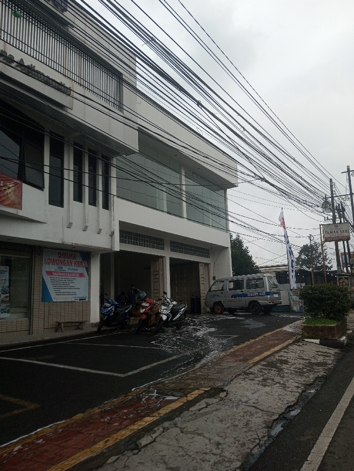 The image displays an urban street scene in Indonesia, as indicated by visible Indonesian text on multiple signs, not Tangsibi, Bhutan. The sky is overcast, with numerous black utility cables crisscrossing the upper portion of the frame. The dominant structure is a multi-story white commercial building featuring a modern facade with large, dark-tinted windows. On the ground floor's left section, a blue and white sign, in Indonesian, reads "DIBUKA LOWONGAN KERJA" (JOB VACANCY OPEN) and lists positions like "SALESMAN & KASIR". Several motorcycles, including blue, red/brown, and white models, are parked on the asphalt in front of the building's open bays, surrounded by standing water and white foamy residue, consistent with vehicle washing activities. Two individuals are partially visible within one of these bays; one wears a blue top, the other a white top. To the right of the motorcycles, a light-colored minivan, labeled "SERVICE CAR" on its side, is parked, facing away from the viewer. Another white vehicle is partially visible behind the minivan. Further right, a white flag on a pole, a brown sign displaying "KOPI KOPITAN" and "TAMAN SARI", and green trees are visible. A small planter with green foliage sits on a concrete sidewalk, which runs parallel to the dark asphalt road. The sidewalk features a distinct reddish-brown curb section.