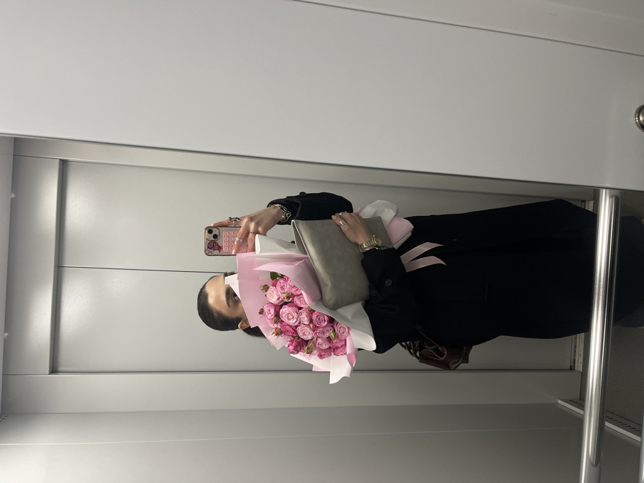 An individual is depicted taking a mirror selfie inside a modern elevator. The person, wearing a dark long coat, has their face largely obscured by a large bouquet of small pink roses wrapped in white and light pink paper, tied with a pink ribbon. A light gray clutch or folder is held against the bouquet on the left arm. The individual's right hand holds a smartphone, equipped with a pink decorative case and finger rings, pointed towards the mirror. Multiple rings are visible on the fingers of both hands, and a gold-toned wristwatch is worn on the left wrist. A dark brown shoulder bag hangs on the person's left side. The elevator interior features reflective walls and light gray double doors with a central seam. A silver-colored horizontal handrail runs along the bottom of the visible frame. The specific location within the city of Yerevan, Armenia, is not discernible from the provided visual information.