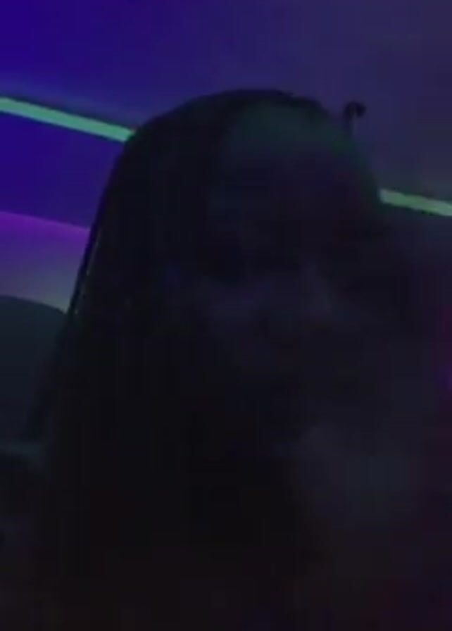 person with braids in dim lighting. The lights above are casting both green and purple. The person is looking at the camera and moving their lips in sync with the audio that is playing. The lighting is very dark, and the person's face is not clearly visible.