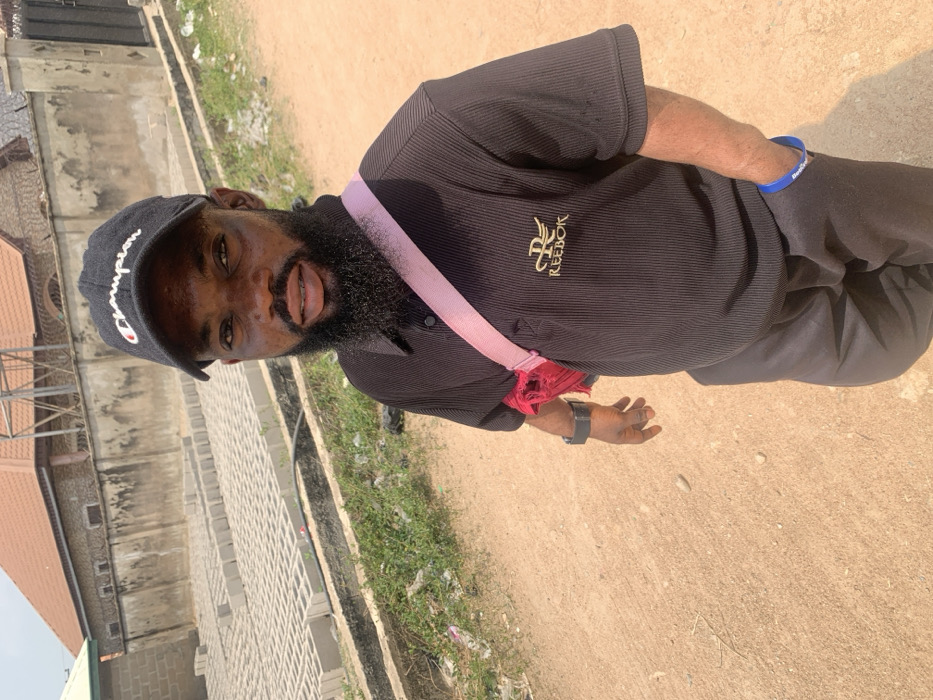 An adult male, exhibiting dwarfism, stands outdoors on unpaved light brown earth in Eika-Adagu New Layout, Nigeria