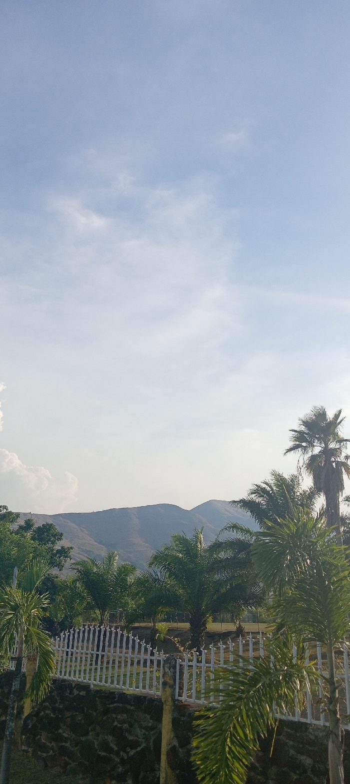 The image displays an outdoor landscape, located in Vallecito, Venezuela. The upper two-thirds of the frame is dominated by a light blue sky featuring scattered white cirrus and cumulus clouds. A range of distant, undulating hills or mountains with a grayish-brown hue stretches across the mid-ground. In front of the hills, a white metal fence with pointed finials is visible, positioned atop a dark stone wall constructed from irregular rocks. Behind the fence, a green grassy area is present, dotted with several small palm trees. More prominent palm trees, characterized by their dark green fronds, occupy the foreground and mid-ground, partially obscuring the fence and wall at the lower left and right edges. A yellowish concrete post supports the white fence on the left. No individuals, specific actions, or interactions are depicted.