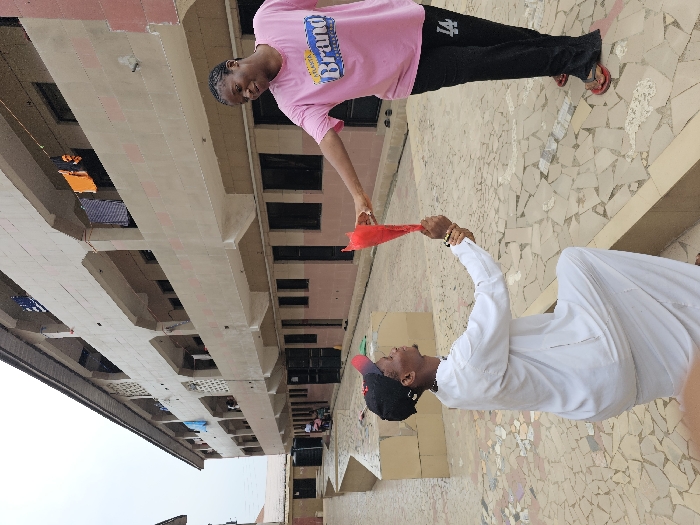 An outdoor scene in Ihiagwa, Nigeria, captures two individuals interacting within a paved courtyard