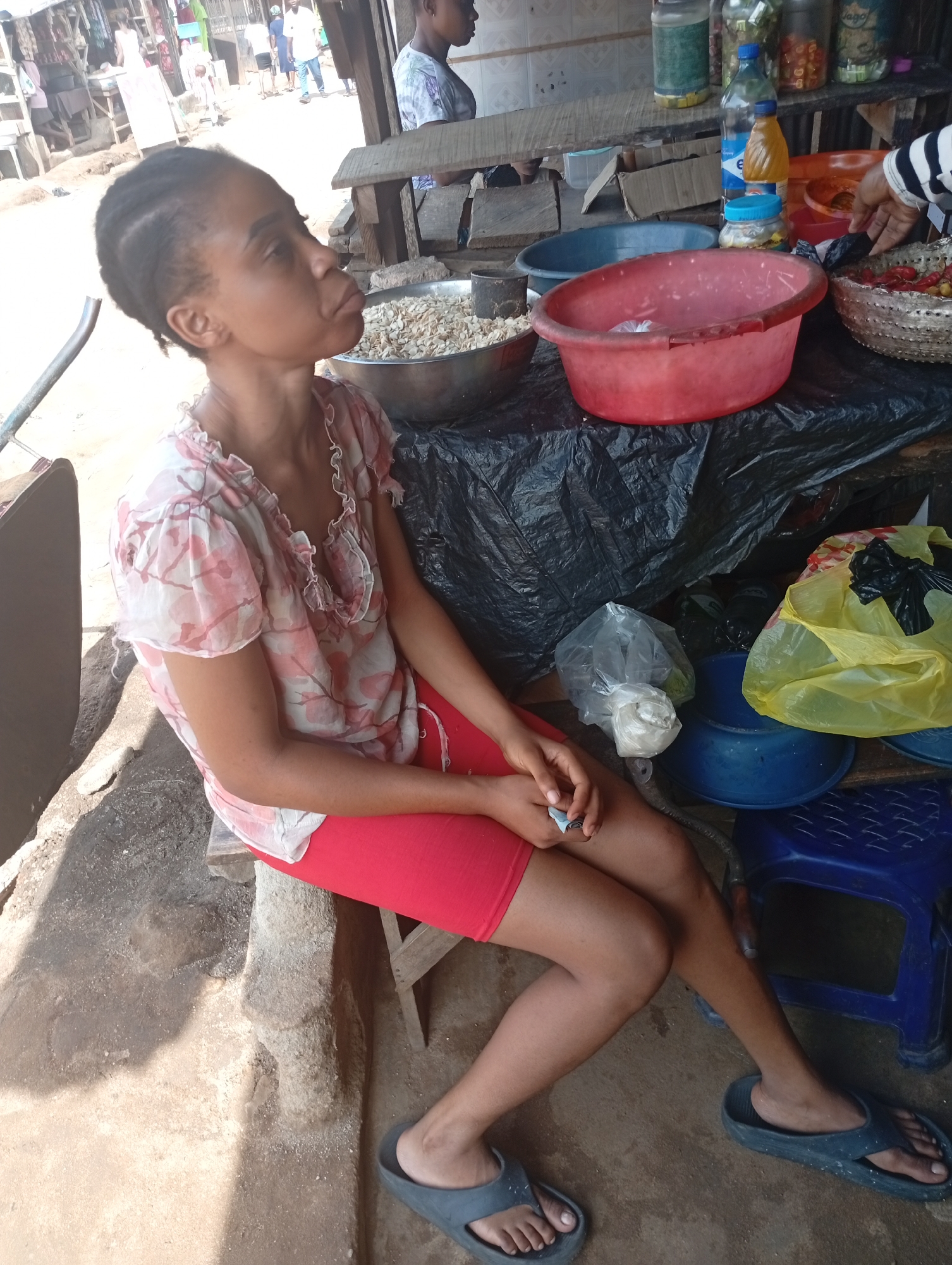 A woman with braided hair sits on a concrete ledge, seemingly waiting for customers at her outdoor market stall in Owerri, Nigeria