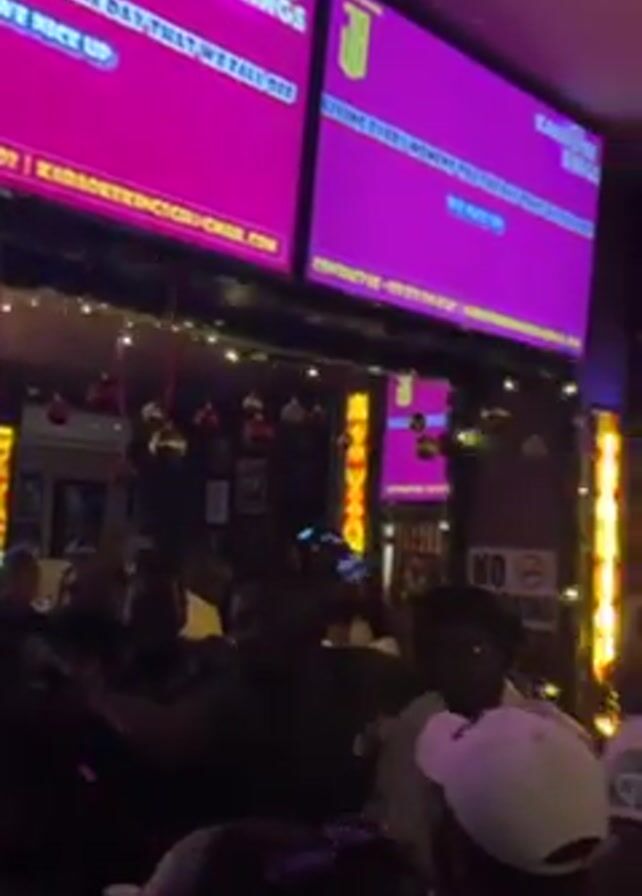 lively scene inside what appears to be a karaoke bar, with a large group of people gathered, some singing and dancing, others watching