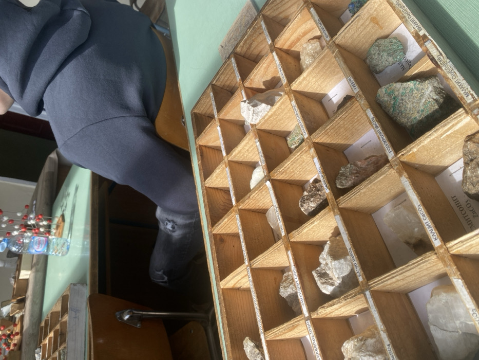 The scene depicts an indoor educational setting, likely a science classroom or laboratory, in Sofia, Bulgaria. In the foreground, a multi-compartment wooden display tray is filled with various mineral and rock samples. Each compartment contains a distinct sample and is labeled with a white paper strip bearing the mineral's name and chemical formula in Bulgarian (e.g., "КАЛЦИТ CaCO3", "СМИТСОНИТ ZnCO3", "МАЛАХИТ Cu2(CO3)(OH)2"). The samples exhibit diverse colors and textures, including white, grey, brown, and green specimens. In the mid-ground, a light green tabletop serves as the surface for the mineral display. In the upper-left background, a portion of another similar wooden display tray is visible. Seated at the table in the background is an individual, visible from the mid-torso down. The person wears a dark blue or black hooded sweatshirt and dark, distressed jeans, with legs crossed. They are seated on a light brown wooden chair with a metal frame. On the tabletop behind the foreground tray, a clear plastic bottle of Devin brand mineral water is present, next to a molecular model constructed from red and white spheres connected by rods. Strong natural light illuminates the scene, casting distinct shadows on the objects and surfaces. No active interaction between the individual and the displayed items is observed; the scene appears set for educational study.