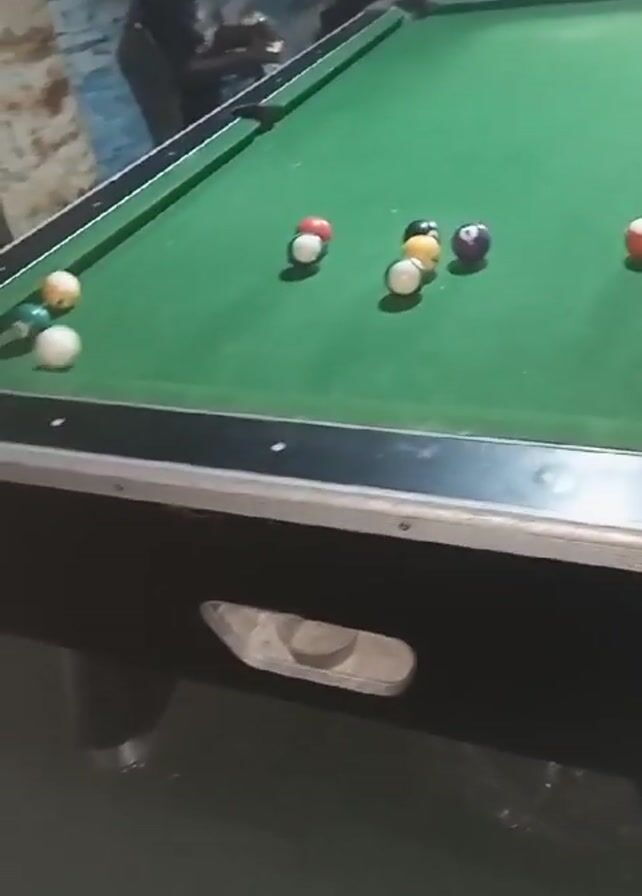 A medium shot shows a pool table with various pool balls arranged on its green felt surface. A person in a white top is poised to make a shot. The camera shakes slightly after the shot. Two additional people are partially visible in the background. The pool table is black with silver trim. The room appears to be dimly lit with a rough wall texture in the background.