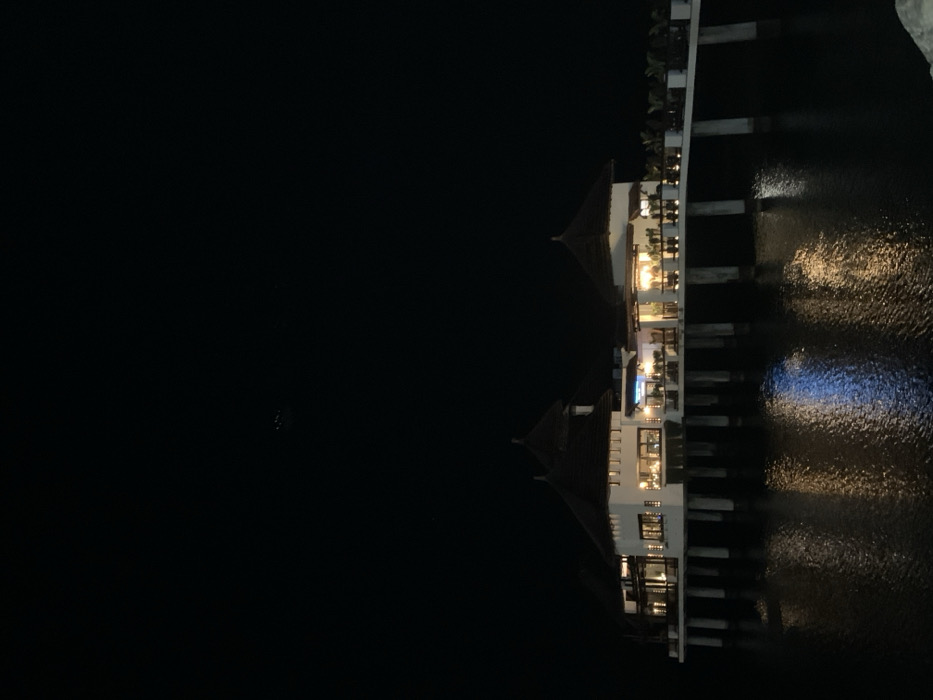 At night, a multi-tiered white building extends into dark water, supported by rows of pillars. Lights illuminate the building's interior, reflecting on the water's surface. The structure has a distinctive roof design, possibly with multiple peaks. The water appears textured with visible patterns, possibly due to ripples or reflections. The surrounding environment is mostly dark, with minimal details beyond the water and the illuminated building.