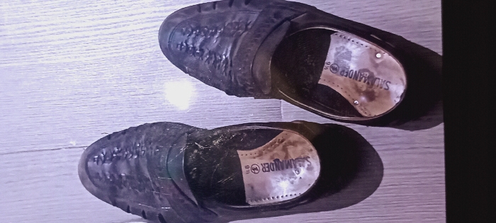 The image displays two dark-colored, possibly black, leather loafer-style shoes, viewed from an overhead perspective. Both shoes feature a textured, embossed pattern, consistent with a crocodile or alligator print, across the vamp area. The insoles are visible, indicating the shoes are unoccupied. Each insole is light tan or beige, bearing the brand name "SALAMANDER" printed vertically and the size "9 1/2" in smaller text. Light-colored particulate debris is present inside the left shoe. The shoes rest on a light-colored surface with visible grain lines, consistent with a wooden or laminate floor. A distinct, bright reflection of light is present on the floor between the shoes. The lower section of the image is obscured by a solid black bar. No individuals are depicted, and no actions or interactions are occurring. The specific location in Fez, Morocco, or any other geographical detail, cannot be determined from the visual information provided within the image.