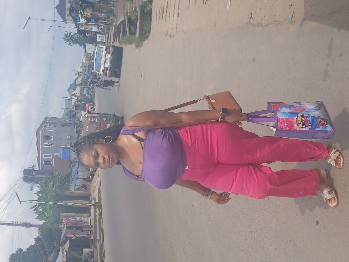 A woman is depicted walking on a paved street in Umuode, Nigeria, under an overcast sky. She is in the foreground, facing slightly left and looking forward. She wears a purple strapless top over a black bra, pink pants with buttons near the ankles, and gold-colored embellished sandals. Her dark hair is braided and styled upwards. She wears large gold hoop earrings and multiple bracelets on her left wrist. A brown shoulder bag with a gold emblem hangs from her right shoulder, and she carries a purple tote bag featuring a printed image in her left hand. The street is a two-lane asphalt road with an unpaved shoulder on the right. In the middle ground, a green and yellow auto-rickshaw (Keke Napep) is partially visible behind the woman. Further down the street, a white sedan is parked or driving, and another individual is visible walking. The background features various commercial and residential buildings, including a prominent gray multi-story building with small square windows and a water tank on its roof. Utility poles with power lines and a street light with a solar panel are present. Sparse vegetation and smaller, less defined structures with corrugated roofs line the sides of the road.