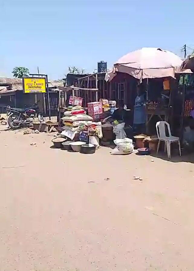 The video opens with two men riding on a motorcycle. The driver wears an orange and white jacket and a baseball cap, while the passenger has on a blue and white patterned hat and a light gray shirt. The motorcycle navigates a street lined with makeshift shops under umbrellas. One shop displays a variety of goods including sacks of rice, bowls, and other items. The environment appears to be a marketplace in a sunny, urban area. Other motorcycles and people are visible in the background.
