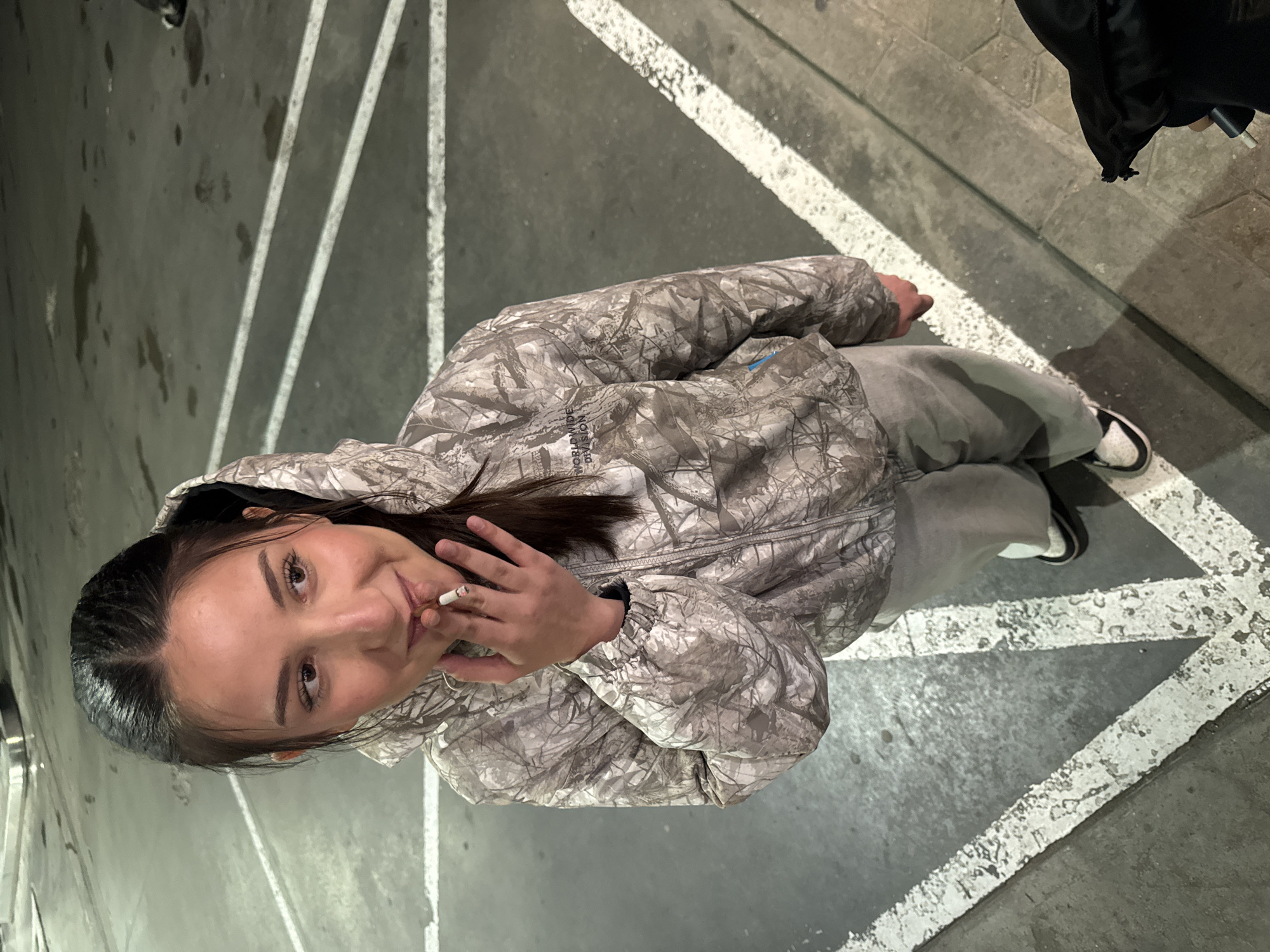 A young adult female is observed standing in an outdoor paved area in the city of Polikraishte, Bulgaria, under artificial illumination during what appears to be nighttime. She has dark hair pulled back and wears a hooded jacket with a grey, white, and brown camouflage pattern, displaying "WORLDWIDE DIVISION" text on the left chest. She is also dressed in light grey loose-fitting pants and black and white sneakers. Her right hand holds a lit cigarette positioned near her mouth, and she is looking towards her left with a slight expression. The ground consists of dark grey asphalt with distinct white painted lines, indicating parking space demarcation, and scattered wet patches are visible. A dark fabric object is partially present in the lower right foreground.