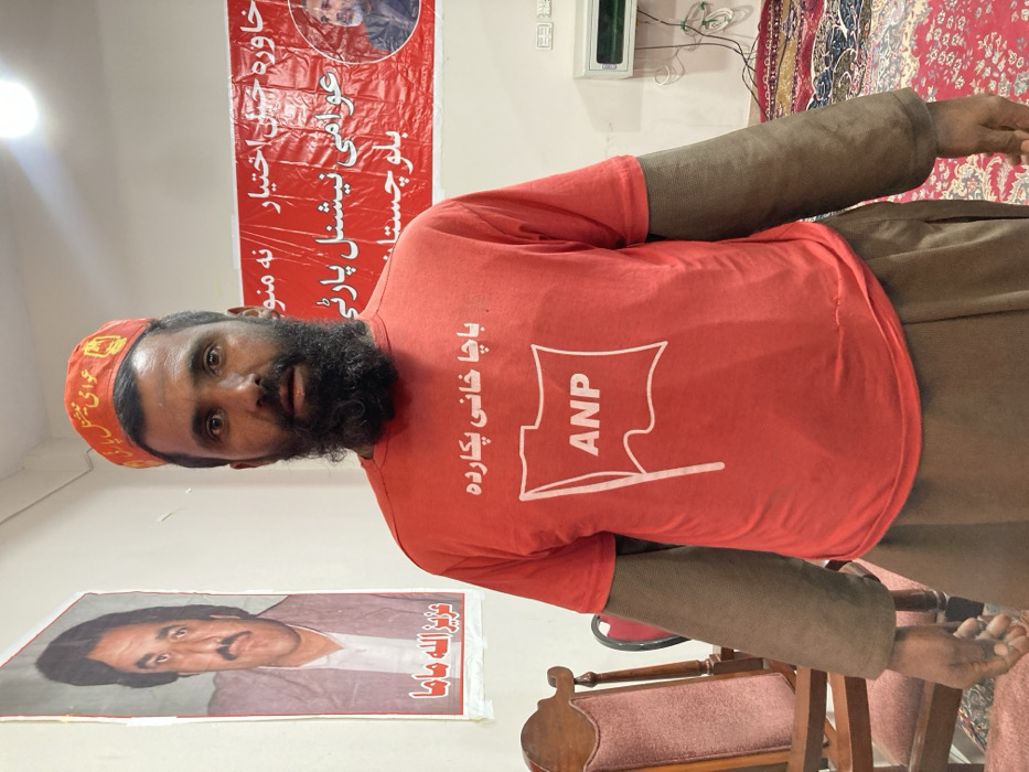A male individual stands indoors, centered in the frame, in what is identified as Quetta City Tehsil, Pakistan. He possesses dark skin, a full black beard, and dark eyes, looking directly at the camera with a neutral expression. He wears a red short-sleeved t-shirt featuring a white flag graphic with "ANP" text and Pashto script "بچہ خانی پکارده" (Bacha Khani Pakarda) above it. A long-sleeved brown garment is visible underneath the t-shirt, and he wears brown trousers or shalwar. On his head, he sports a red cap with yellow Pashto script "عوامی نیشنل پارٹی" (Awami National Party) and an emblem. The background consists of light-colored walls. To the left, a vertical poster taped to the wall displays a portrait of a man with a mustache and the Pashto script "وزیر اللہ ماما" (Wazirullah Mama) below it. To the right, a large red horizontal banner, also taped to the wall, features white Pashto script "خاورہ حق اختیار نہ منو" and "عوامی نیشنل پارٹی بلوچستان" (Awami National Party Balochistan), along with a circular portrait of an older man. Two wooden chairs with maroon upholstery are partially visible on the left side. The floor is covered with a patterned rug, predominantly red with intricate designs. An electrical box is mounted on the wall to the right, with visible wiring below it. Overhead lighting illuminates the scene.