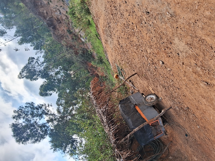 The image captures an outdoor, unpaved environment in Karingani ward, Kenya, dominated by an inclined reddish-brown dirt path. In the lower-left foreground, a dark grey, wheeled industrial machine, possibly a generator or air compressor, with an orange horizontal stripe, rests on the slope. It is partially covered by a makeshift shelter composed of dried branches and foliage, supported by several raw wooden poles. Coiled black cables or hoses are visible on the ground next to the machine. The ground consists of loose dirt, small rocks, and sparse dry plant material. To the immediate left of the path, dense green undergrowth and smaller trees are present. The terrain slopes upwards and to the right, revealing a steep embankment of reddish-brown soil with patches of green vegetation. The background is characterized by numerous tall, slender trees with dense green foliage, consistent with Eucalyptus species, under a partially cloudy sky with white and grey clouds against a blue expanse. No individuals or active interactions are depicted within the static scene.