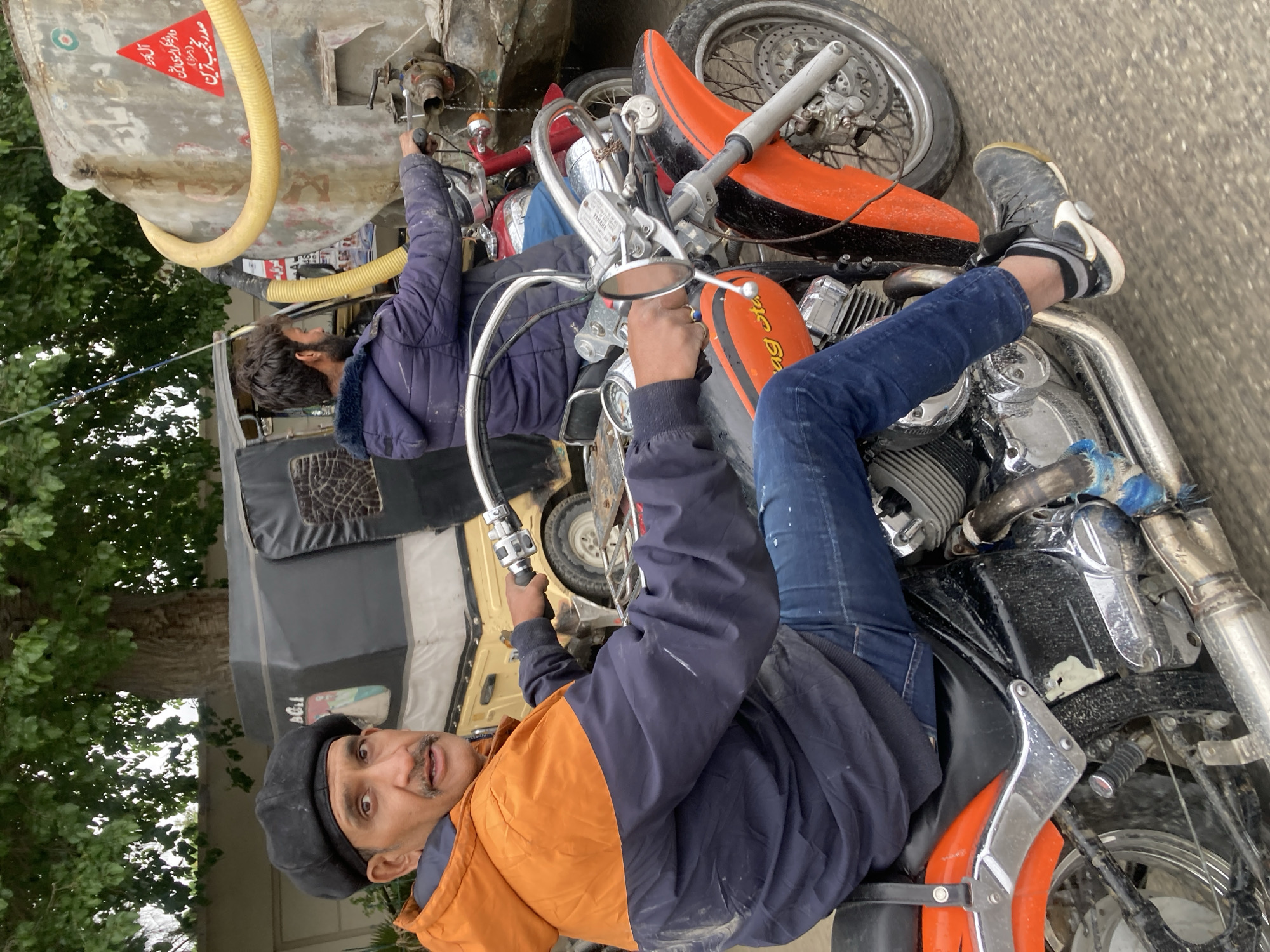 The image depicts two men interacting with a vehicle in what appears to be Quetta City Tehsil, Pakistan. One man, wearing a dark cap and a jacket with orange and navy blue panels, is seated on an orange and black motorcycle. He is holding the handlebars and looking at the camera. The second man, wearing a dark jacket, stands beside the motorcycle, reaching toward a large, gray water tank with a yellow hose attached. Behind them is a three-wheeled vehicle. Green trees are visible in the background.