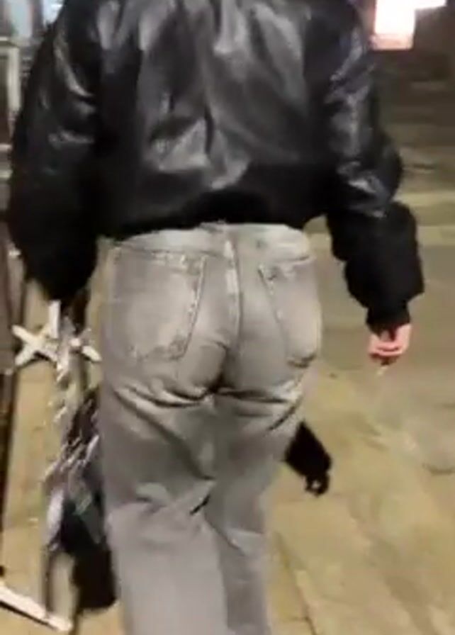 A woman in a black jacket and light gray jeans walks on a sidewalk at night, carrying a purse