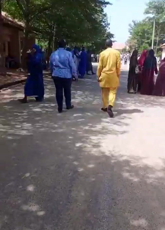 group of people walking on a paved path on a sunny day. There are trees lining the side of the path, casting shadows. The people are dressed in various styles of clothing, including traditional attire, and some are talking to each other. The path leads towards a building in the background.
