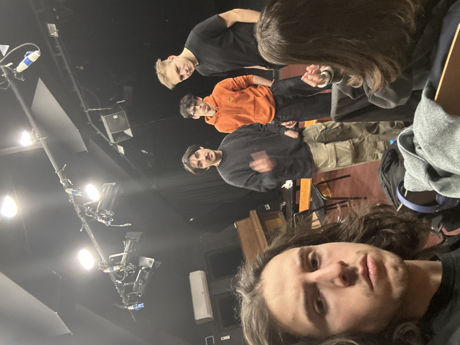 The image depicts five individuals within an interior space consistent with a theatrical rehearsal room or small performance venue in Sofia, Bulgaria. The specific location within Sofia cannot be definitively identified from the image alone, but the environment features characteristics typical of facilities at institutions like the National Academy for Theatre and Film Arts (NATFA) or similar cultural centers. The setting is characterized by dark walls and ceiling, with multiple overhead stage lighting fixtures mounted on black trusses. A speaker is suspended from the ceiling to the right, and an air conditioning unit is mounted on the upper left wall. An upright wooden piano, several black chairs with wooden seats, and a wooden bench are visible on the floor, indicating a versatile functional space. In the immediate foreground, a young male with long, dark, wavy hair, wearing a black top, faces the camera, capturing a selfie. Blue headphones are visible on an object to his left. To his right, the back of a person with long, dark hair is visible, seated and facing away from the camera, with their hands clasped. Three young males are standing in the mid-ground, generally facing towards the seated individual or the selfie-taker. From left to right: 1. A male with dark hair and a mustache, wearing a dark long-sleeved shirt and light-colored cargo pants. His right hand is blurred, indicating motion. 2. A male with short dark hair and glasses, wearing an orange hoodie and dark pants, with his hands in his pockets. 3. A male with short blonde hair, wearing a black t-shirt and dark pants, with his left hand in his pocket. The individuals appear to be engaged in an informal interaction within the performance-oriented environment.