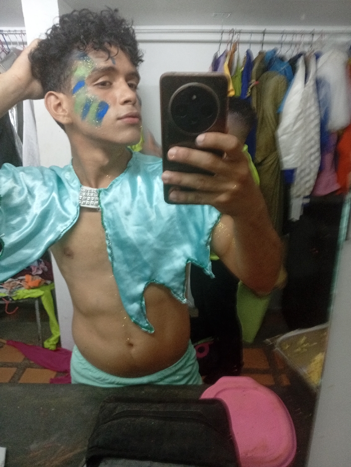 A person poses for a selfie in a dressing room. They wear a light blue satin outfit with sparkly accents, possibly a costume. Face paint in green and blue adorns their cheek. The background shows a clothing rack with various garments, suggesting a backstage area. A cluttered table with a black bag and pink item sits in front of the mirror. The overall impression is one of preparation for a performance.