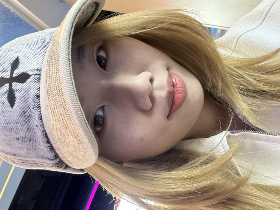 A close-up portrait image features a single East Asian female subject positioned centrally. She has long, straight, blonde-dyed hair falling over her shoulders and a fair complexion. Her dark brown irises are directed towards the camera, and her lips are closed with a subtle, light pink tint. She wears a distressed light-wash denim baseball cap with a contrasting beige brim, featuring a dark, four-pointed cross-like emblem on the front, slightly to the viewer's left. A light-colored, possibly white or off-white, textured jacket or top with a visible zipper is worn. The background is blurred, indicating an indoor setting with a shallow depth of field, and includes an out-of-focus bright pink light source visible in the upper left quadrant. The specific location within Jiulongpo District, China, is not discernible from the visual evidence.