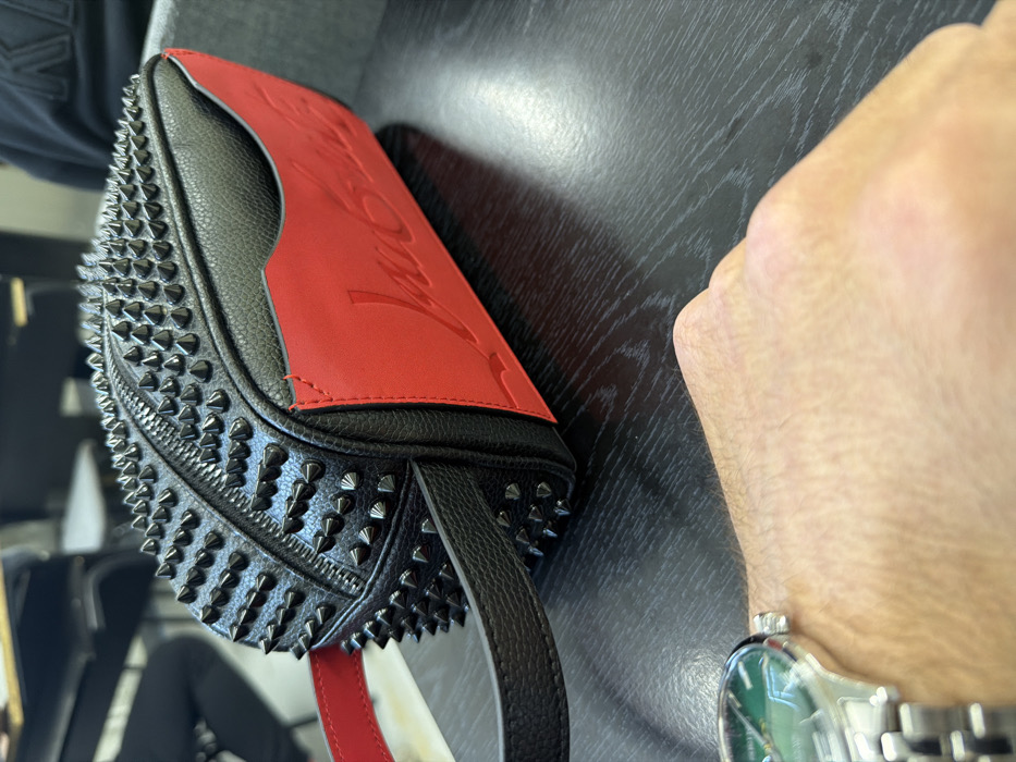 An indoor scene depicts a black, cylindrical Christian Louboutin toiletry bag positioned on a dark, wood-grained table. The bag is extensively covered with black conical metal studs, features a central zipper closure, and has a prominent red leather panel on its right side embossed with the "Christian Louboutin" signature. A black leather carry handle is visible on the bag's left end. In the lower-left foreground, a Caucasian male's forearm and wrist are visible, wearing a silver-toned wristwatch with a green dial. The background is out of focus, showing partial views of black-framed chairs and a person wearing a dark garment, consistent with an office or classroom environment. The location of this scene is stated to be Sofia, Bulgaria.