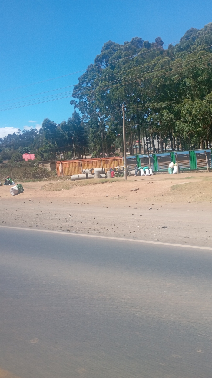 A roadside scene unfolds with a mix of urban and rural elements. A variety of structures line the roadside, including shipping containers in orange and green, and several large concrete pipes. Bags and other items sit on the ground near the pipes, possibly merchandise for sale. Trees dominate the background, and a clear blue sky completes the setting. The road is paved, with visible wear and tear.