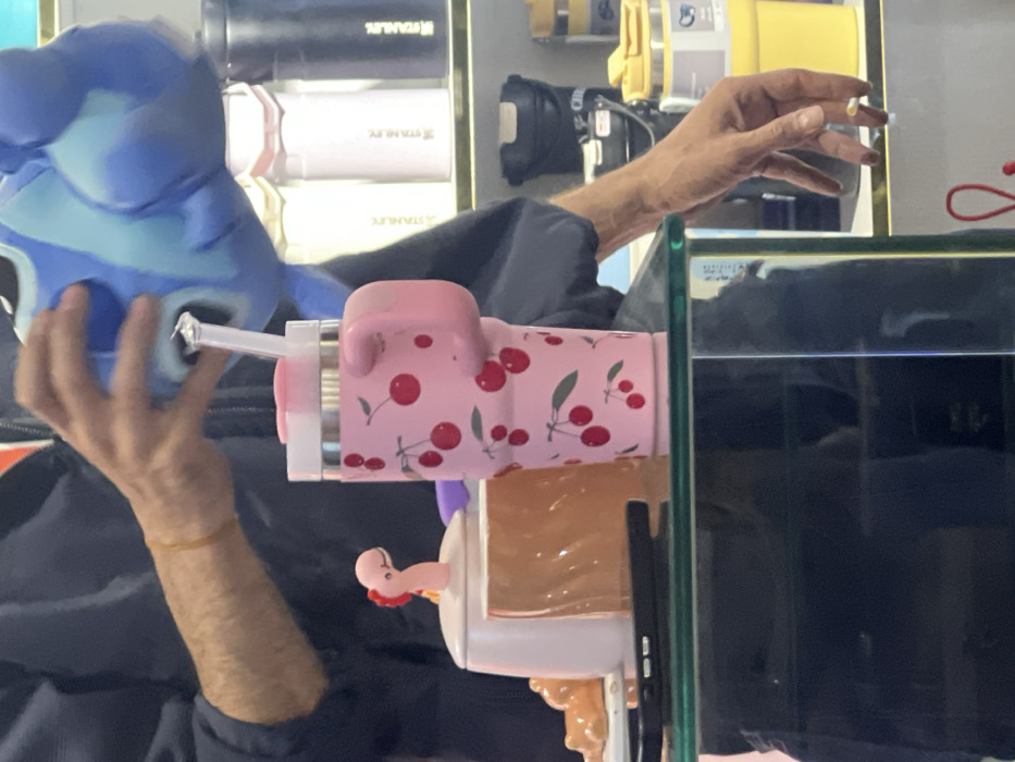 An indoor scene in a retail environment, identified as Barza Municipality, Syria, displays a partial view of an individual positioned behind a clear glass display counter. The person's right forearm, covered by a dark blue long-sleeved garment and adorned with an orange elastic band on the wrist, is actively inserting a clear straw into a pink insulated tumbler. This tumbler, patterned with red cherries, features a white lid and an integrated pink handle. The straw emerges from a blue object, which appears to be a character-themed container or plush toy resembling Stitch. The individual's left hand, observed lower on the right side of the frame, holds a lit cigarette between the fingers. On the glass counter, a white ceramic jar with a lid featuring a small pink finial is visible next to a brown, textured ceramic object. A black smartphone lies horizontally on the same glass surface. In the background, shelving units present an array of insulated containers and thermoses, including several "STANLEY" brand items in white, black, and yellow.