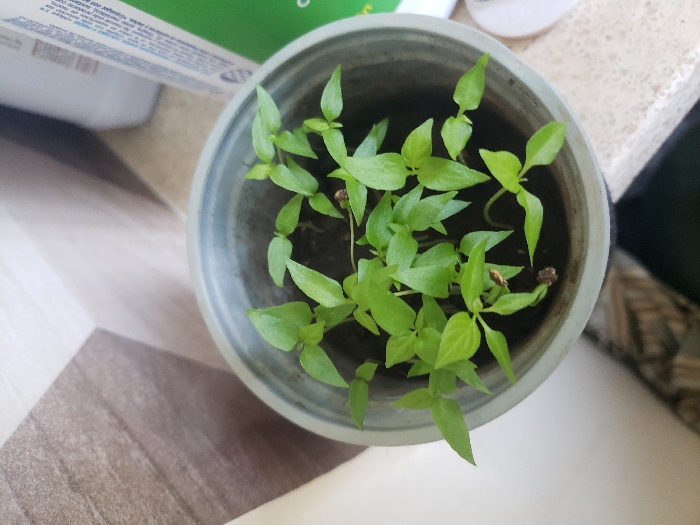 potted plant with green leaves inside a grey plastic pot. The pot is sitting on a white and brown tiled surface. The plant is in the foreground of the image. The background is out of focus. The image was taken in El Córbano, Dominican Republic. The location is a residential area. It is likely that the plant is in a home or a garden. There are no people present in the image. The image is in focus and well-lit. There is no evidence of any activity or interaction. The image is a close-up shot of the plant. The image is not staged and appears to be taken from a casual perspective.