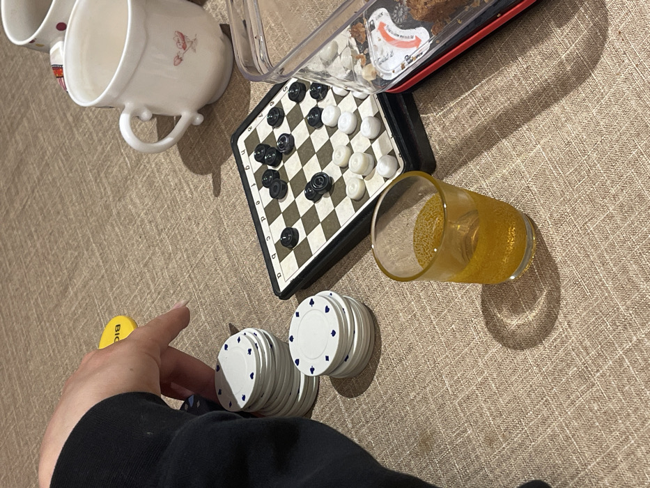 The scene depicts an indoor setting in Jisr az-Zarqa, Israel, featuring a table laden with gaming components, beverages, and a snack. A human left hand, with manicured nails, is visible in the upper left quadrant, positioned above two stacks of white poker chips adorned with blue spade symbols. The larger stack comprises approximately twenty chips, while the smaller contains about ten. A small, yellow circular disc marked "BIC" rests near the hand. Centrally located is a small, portable checkers board with black and white squares, featuring algebraic notation "a, b, c, d" along one edge. Numerous black and white checkers pieces are distributed across the board, suggesting an ongoing or recently concluded game. To the right of the board, a clear glass contains an amber-colored, effervescent liquid. In the upper right, two white ceramic mugs are present; one features a small red graphic, and the other, partially visible behind it, displays red polka dots. A clear plastic container with a red base, containing remnants of a baked good or crumbs, is positioned on the far right. All items rest on a light brown, textured surface, possibly a woven tablecloth, under directional lighting that casts shadows.