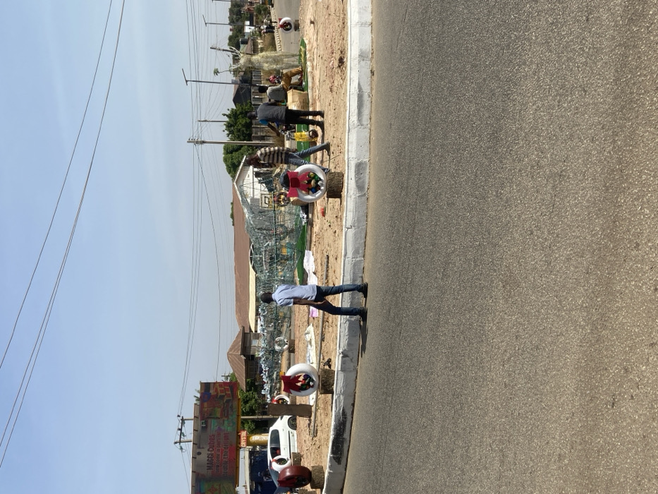 The image displays an outdoor urban scene in Jos, Nigeria, under a clear, bright blue sky