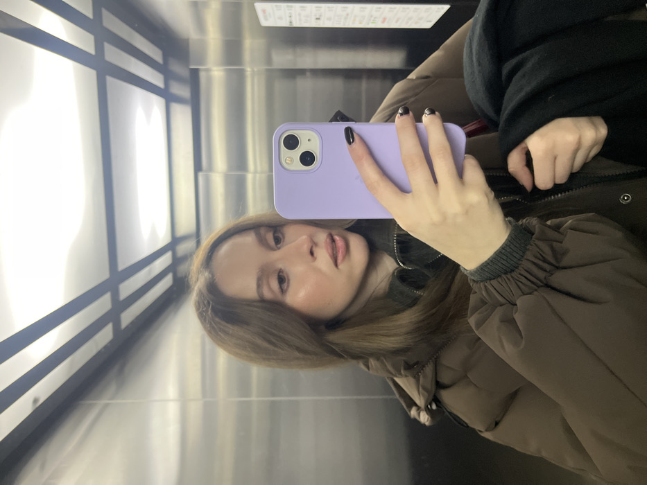 A female individual is depicted taking a mirror selfie inside an elevator located within a building in Minsk, Belarus. The subject has long brown hair and is wearing a dark brown puffer jacket over a dark gray ribbed long-sleeved garment. Her lips are slightly parted, and her gaze is directed towards her right. She holds a light purple-cased smartphone, equipped with a dual-lens camera module, in her right hand; her fingernails are painted black. A black piece of fabric is held by her left hand. The elevator interior features brushed metallic walls. The ceiling contains a square recessed light fixture with internal dark frames. A white, vertically oriented panel displaying indecipherable Cyrillic text is visible on the right wall, partially obscured by reflection.