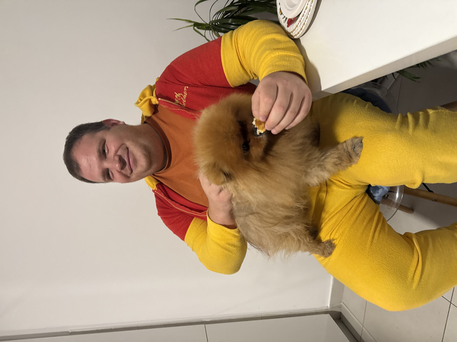 An adult male is seated indoors, identified as being in Boreti, Montenegro. He wears a yellow and red tracksuit, with a red zippered top featuring yellow sleeves and hood lining, and yellow pants. The top has "Winnie the Pooh" embroidered in yellow script on the right chest. The man, with short dark hair and a light complexion, smiles and looks towards the right of the frame. A small, fluffy, orange-brown Pomeranian-type dog sits on his lap, actively eating a small, light-colored food item held by the man's left hand. To the man's right, a white rectangular table holds two white paper plates, one with a red and green floral design. A green houseplant is visible in the background, behind the table. The wall behind the man is plain white, and a white cabinet or door is partially visible on the far left.